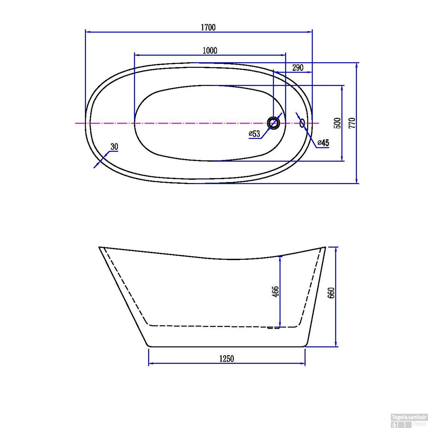 Specificaties BWS Vrijstaand Trapeze Ligbad Acryl 170×77 cm Wit (inclusief waste en overloop):