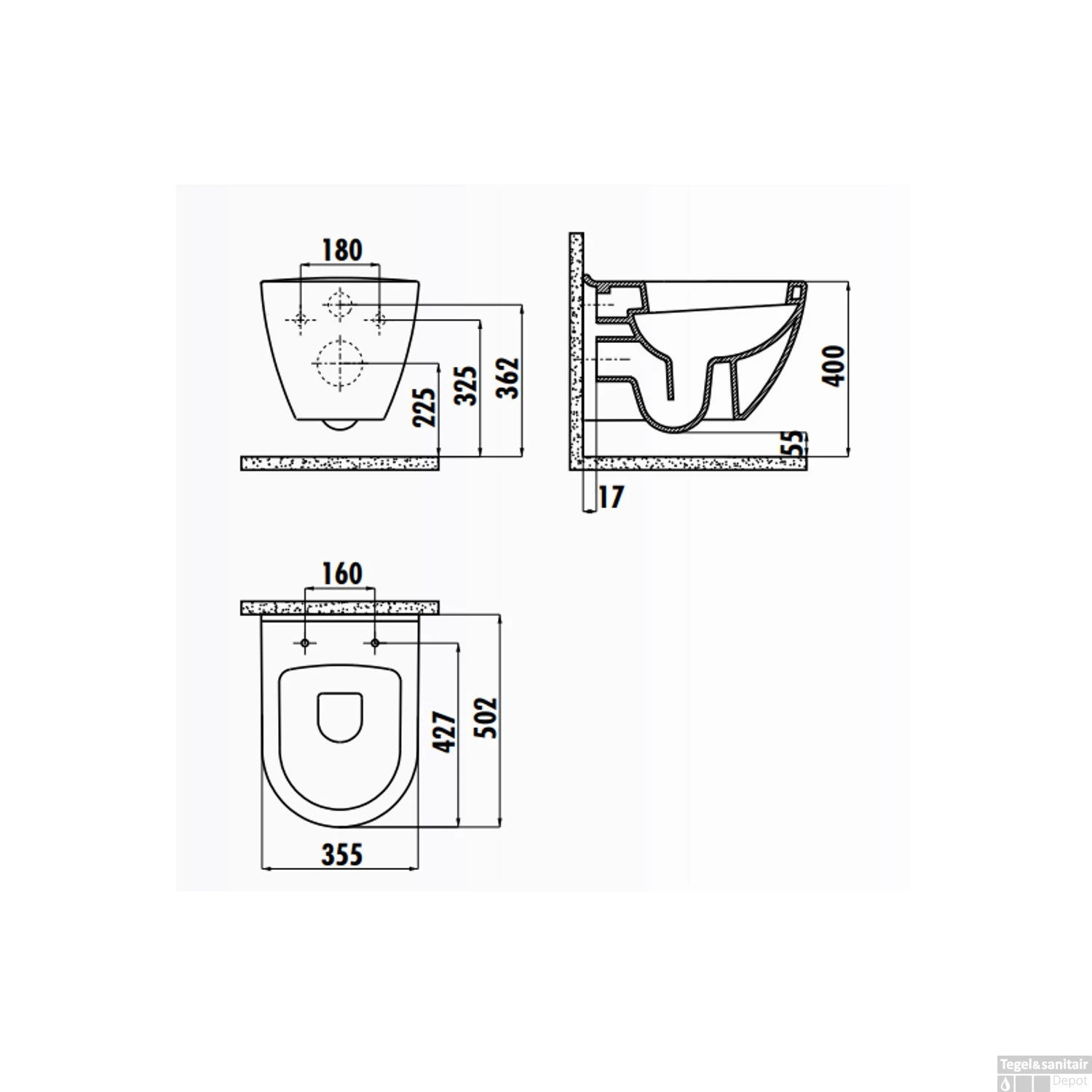 De diepspoel wandcloset is 50cm diep en 35.5cm breed. De hart op hart maat voor de bevestiging van de bril is 15.5cm. De ophangbevestiging is zowel voor 18 en 23 cm (hoh) Dat maakt het mogelijk om de zitting op meerdere reservoirs te hangen. De pot wordt geleverd exclusief zitting.