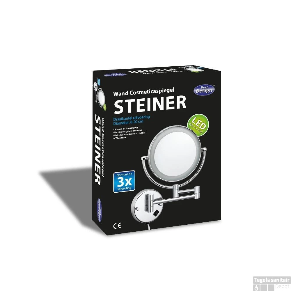 De Cosmeticaspiegel Best Design Steiner Chroom met LED (20 cm) is een mooie en functionele toevoeging aan uw badkamer. De spiegel heeft een vergrotend effect en een (led) lichtrand waardoor het scheren of make-uppen nog makkelijker wordt.
