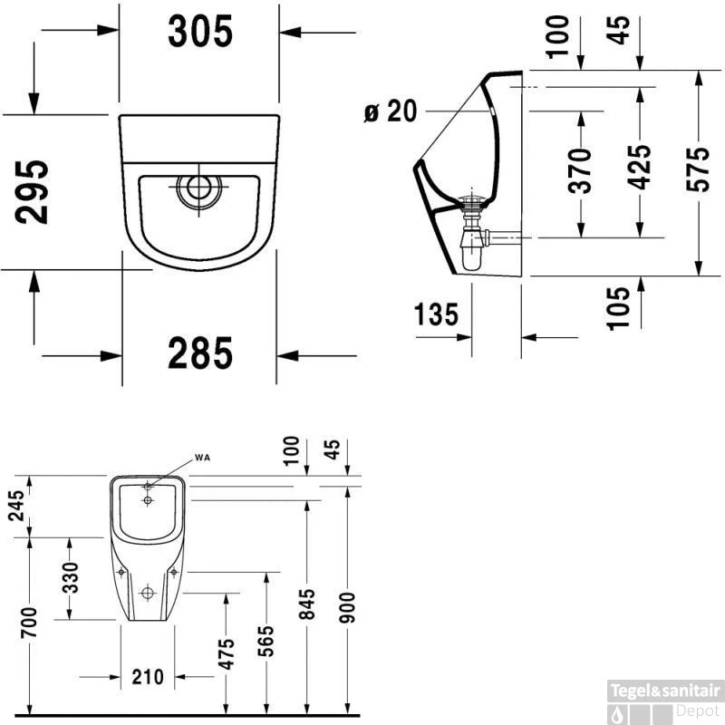 De afmetingen van dit urinoir zijn; 28,5 cm breed met een breedte uitloop naar de muur toe van 30,5 cm. De diepte van dit artikel is maar liefst 29 cm. De hoogte bedraagt maar liefst 56.5 cm.