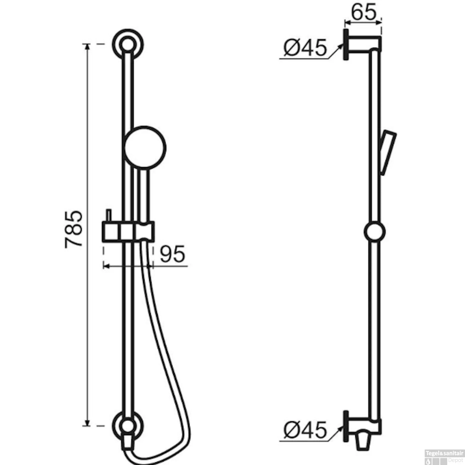 De glijstang heeft een lengte van 78,5 cm. De handdouchehouder is in hoogte te verstellen aan de zijkant van de glijstang. De bevestigingspunten hebben een diameter van 4,5 cm, de glijstang wordt 6,5 cm van de muur af geplaatst. De handdouche zelf heeft een lengte van 25 cm, de kop heeft een diameter van 8,8 cm.