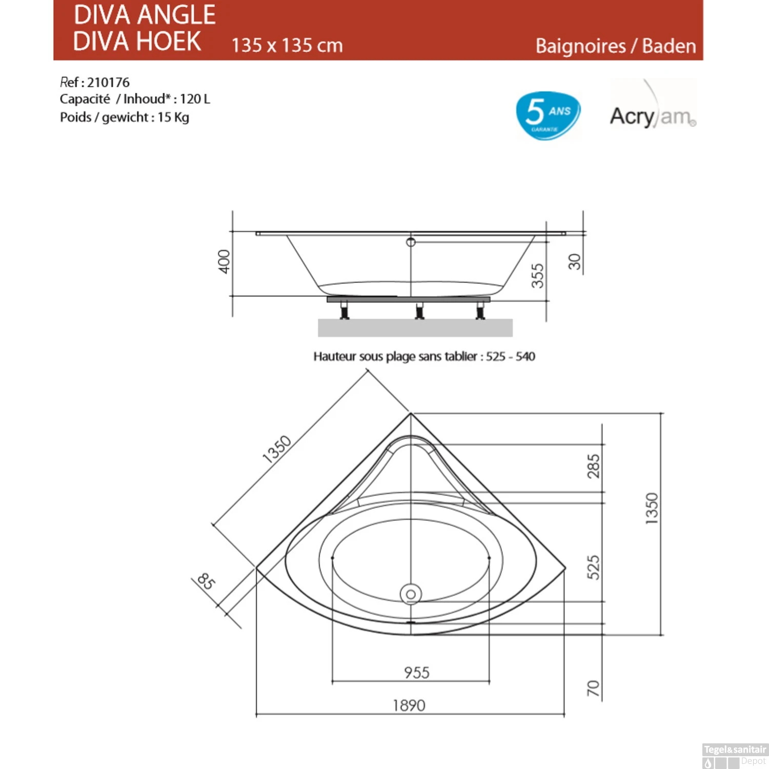 Hoekbad Allibert Diva Kwartrond 135×135 cm