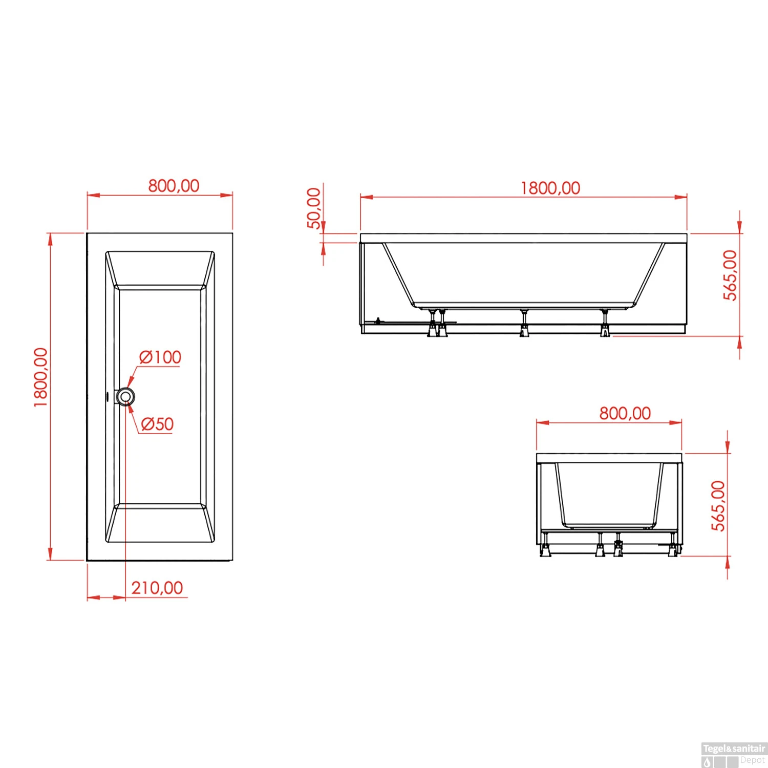 Het bad heeft een lengte van 180, een breedte van 80 cm een een diepte van 42 cm.