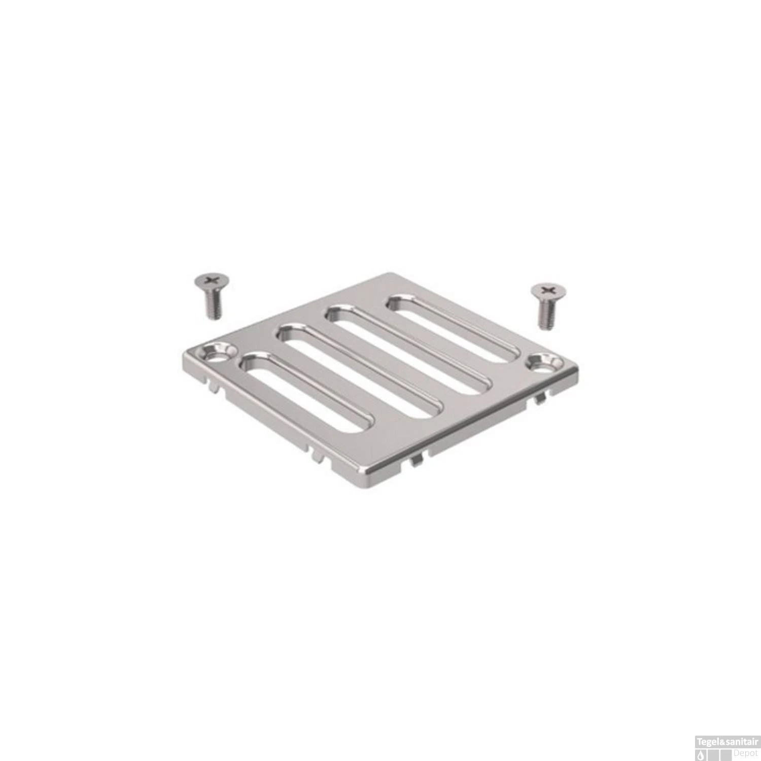 Geberit putrooster met sleufgaten, putrooster roestvaststaal (RVS), vierkant, schroefbevestiging, breedte rooster 71mm, lengte rooster 71mm, diameter rooster 100mm, sleuven.