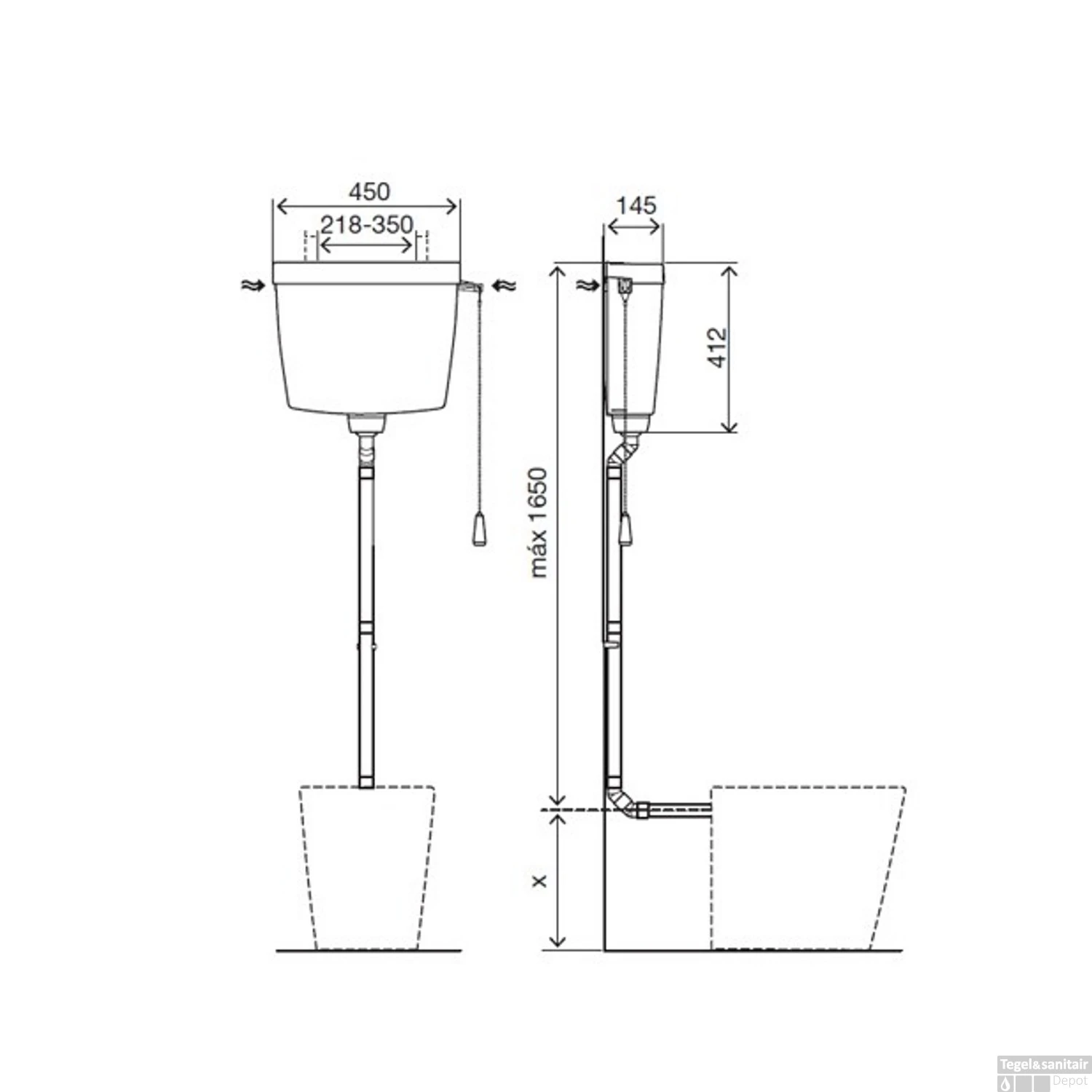 Dit hooghangend kunststof reservoir in wit kan direct aan de muur bevestigd worden boven het toilet en wordt bediend met een closettrekker. Het reservoir heeft een inhoud van 9 liter maar kan, indien gewenst, ook aangepast worden naar 6 liter en wordt geleverd inclusief muurbevestigingsmateriaal, 4 modulaire valpijpen met een diameter van 32 mm en een rubber ring voor aansluiting op de toiletpot.