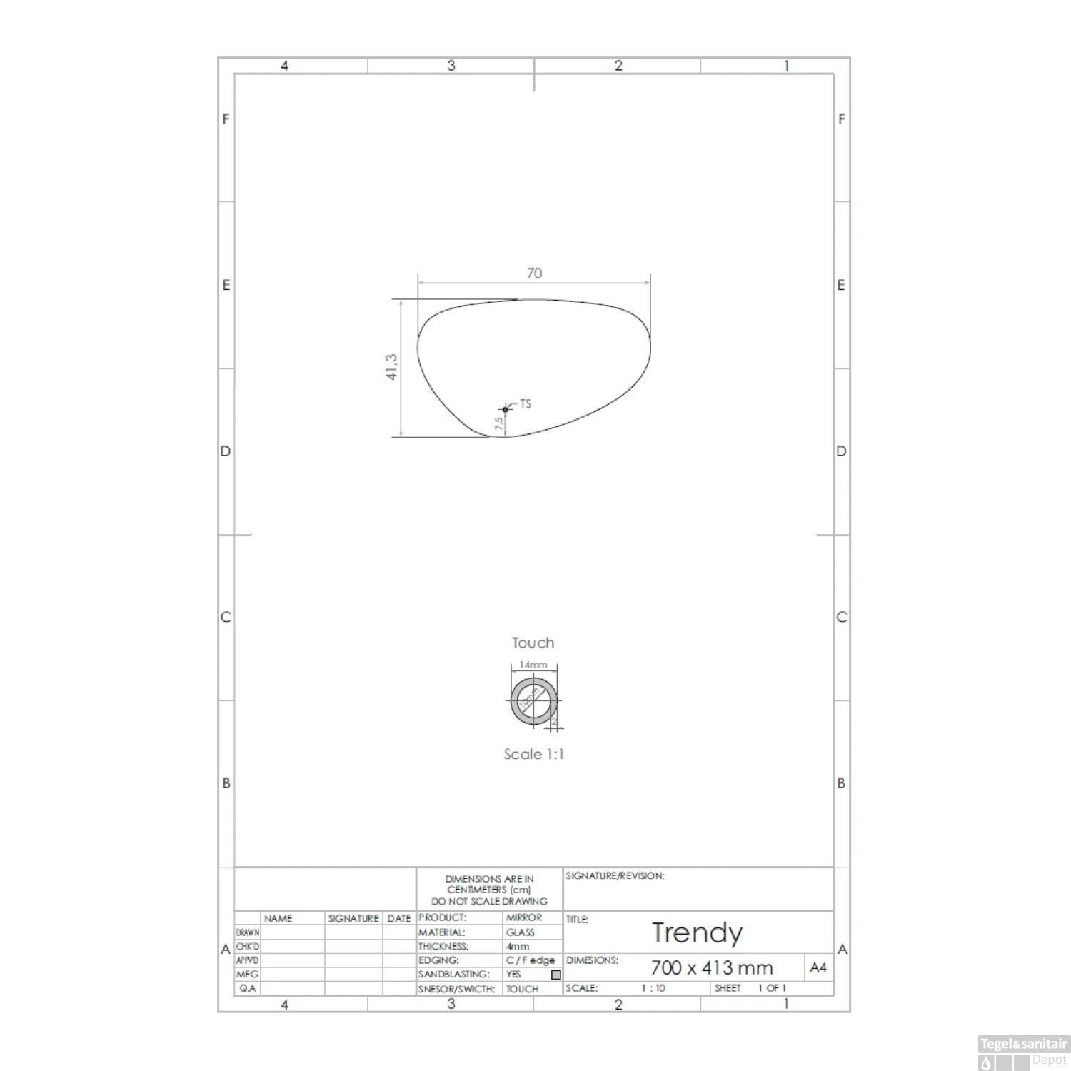 De spiegel is 70 cm breed, heeft een hoogte van 41.3 cm en een glasdikte van 4 mm. Verder bevat de spiegel een touch knop waarmee u de verlichting eenvoudig kunt bedienen en is de spiegel voorzien van een knop voor geïntegreerde spiegelverwarming.