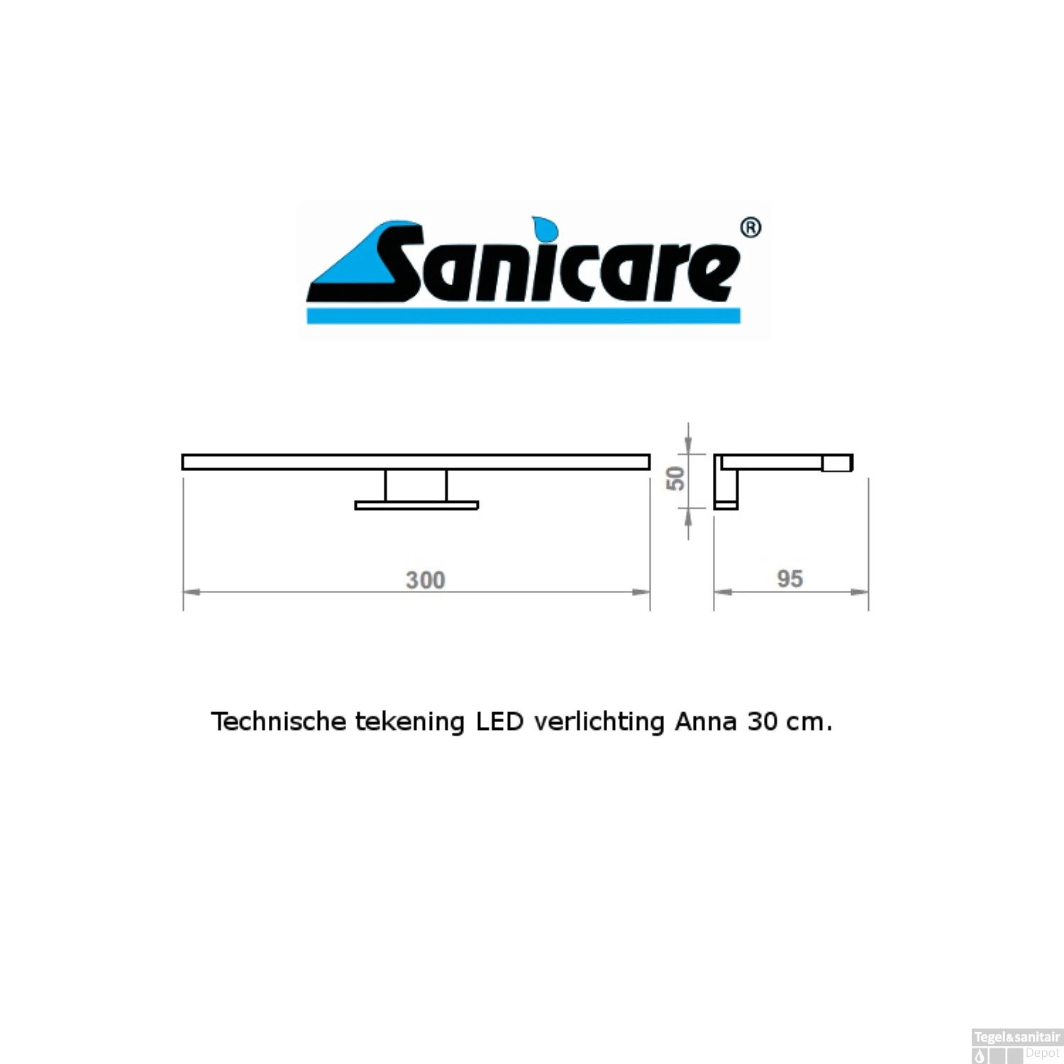 Deze spiegelverlichting van het merk Sanicare behoort tot de serie ‘Anna’. De spiegelverlichting kent een breedte van 30 cm en is uitgerust met LED-verlichting, zodat het uw badkamerof toiletruimte goed verlicht. Het artikel is te bevestigen op een spiegellijst of een spiegelkast. Wanneer u ervoor kiest om de spiegelverlichting te monteren op een spiegel zonder omlijsting (maximaal 0,5 cm) is er een montageclip nodig: deze kunt u onderaan de webpagina los bij bestellen.
