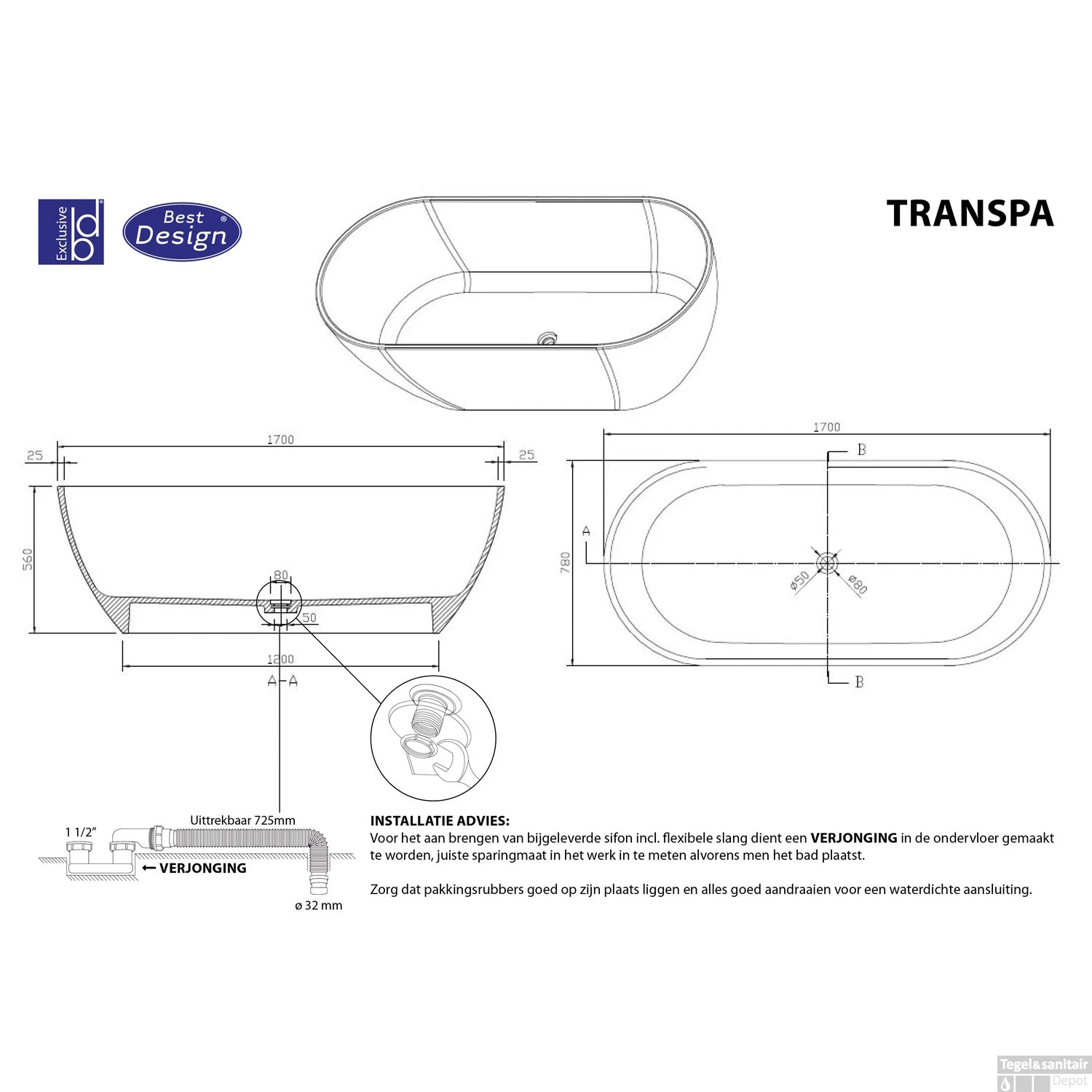 Een vrijstaand bad van het merk Best Design voor een unieke uitstraling in de badkamer. Het bad is vervaardigd uit een soort hars, genaamd resin. Dit maakt het mogelijk dat het bad een transparante afwerking heeft. Het bad is 170 cm lang, 78 cm breed en 56 cm hoog. Verder heeft het bad een ovale vorm en bevat het geen overloop. Het bad wordt inclusief sifon geleverd.